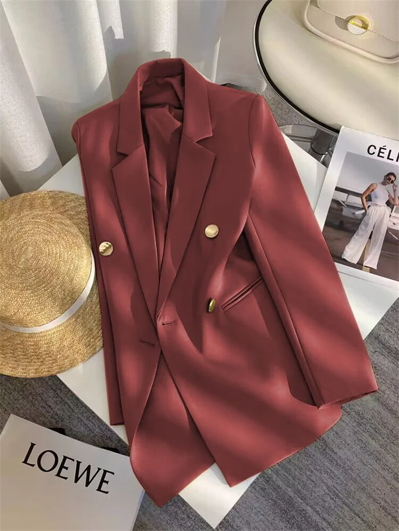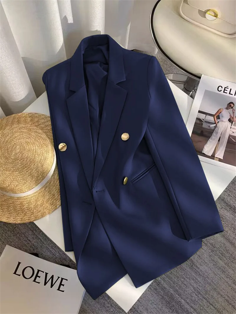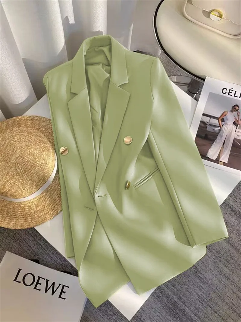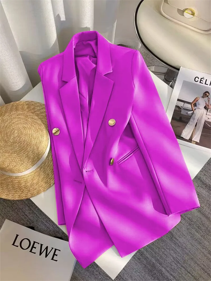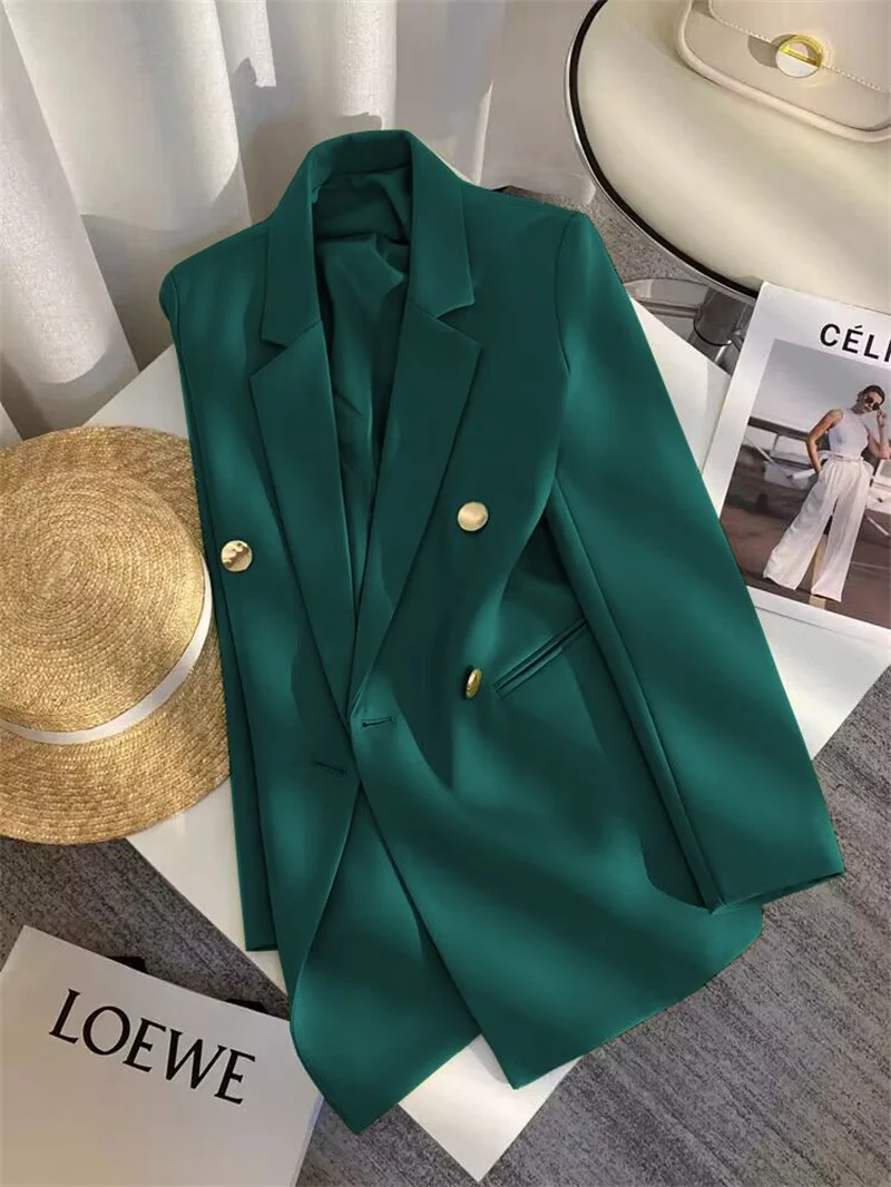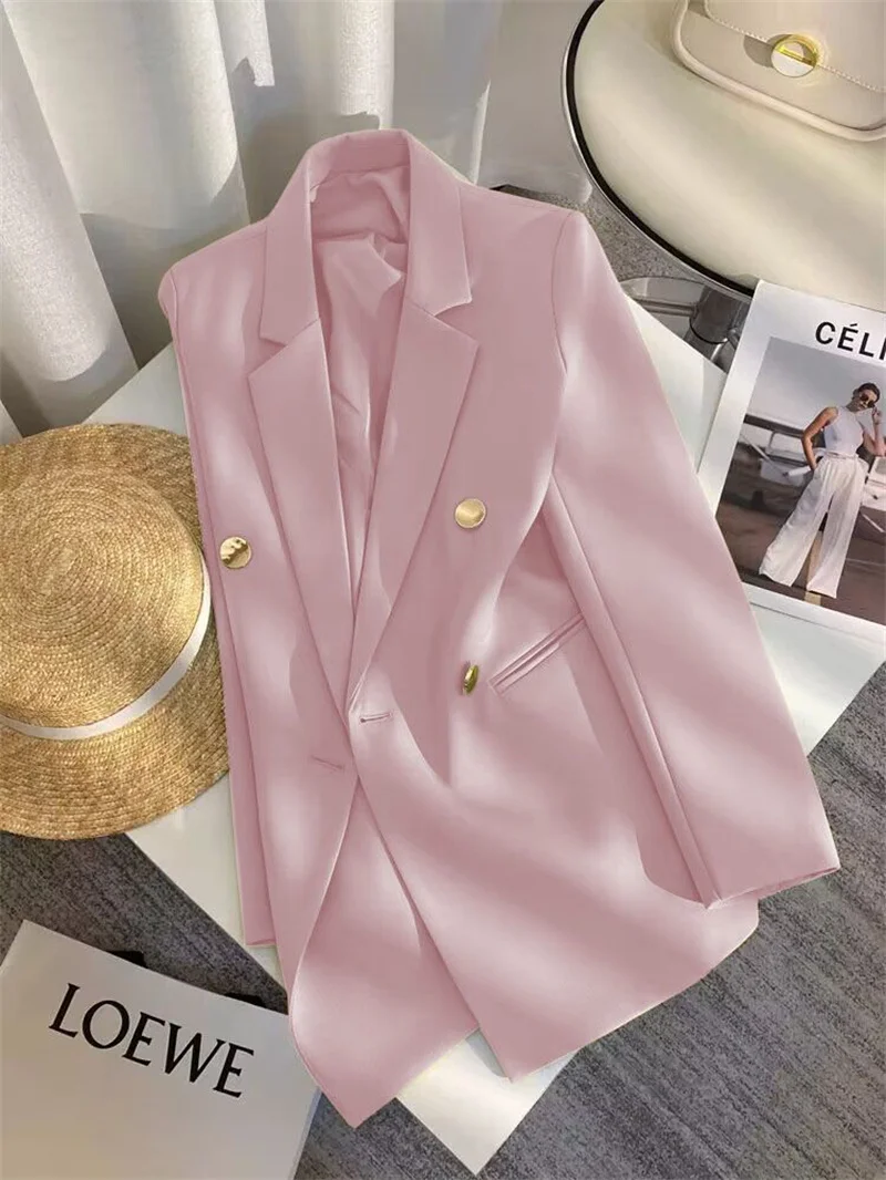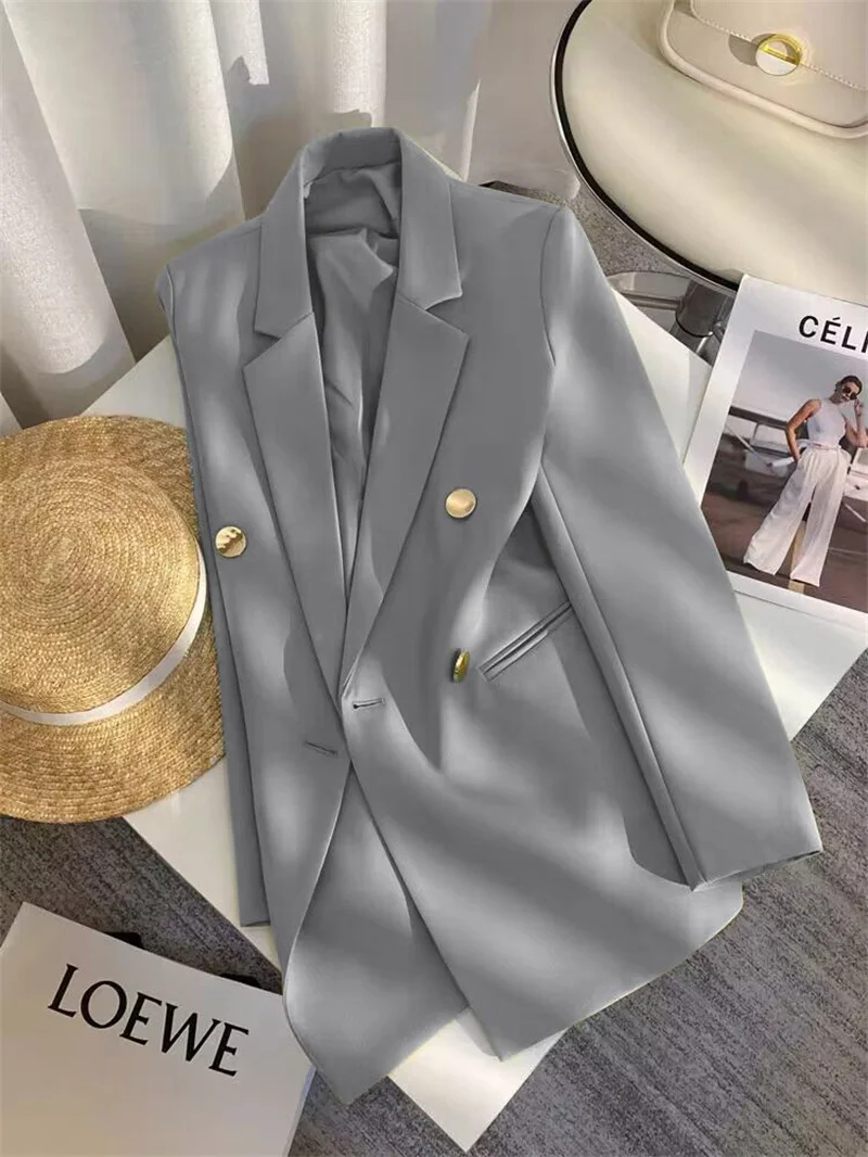 Women's Elegant Metal Buckle White Suit Jacket Casual Office Lady Blazer High-en